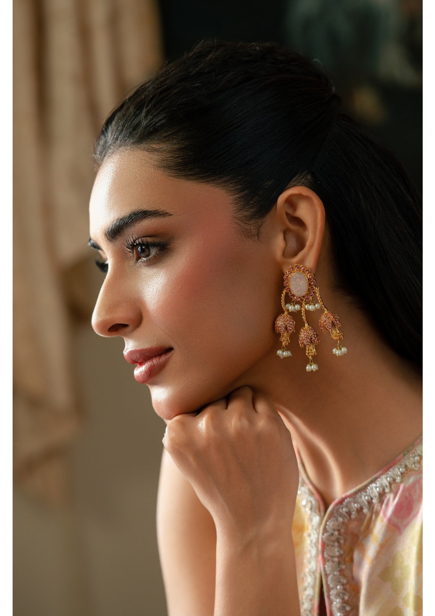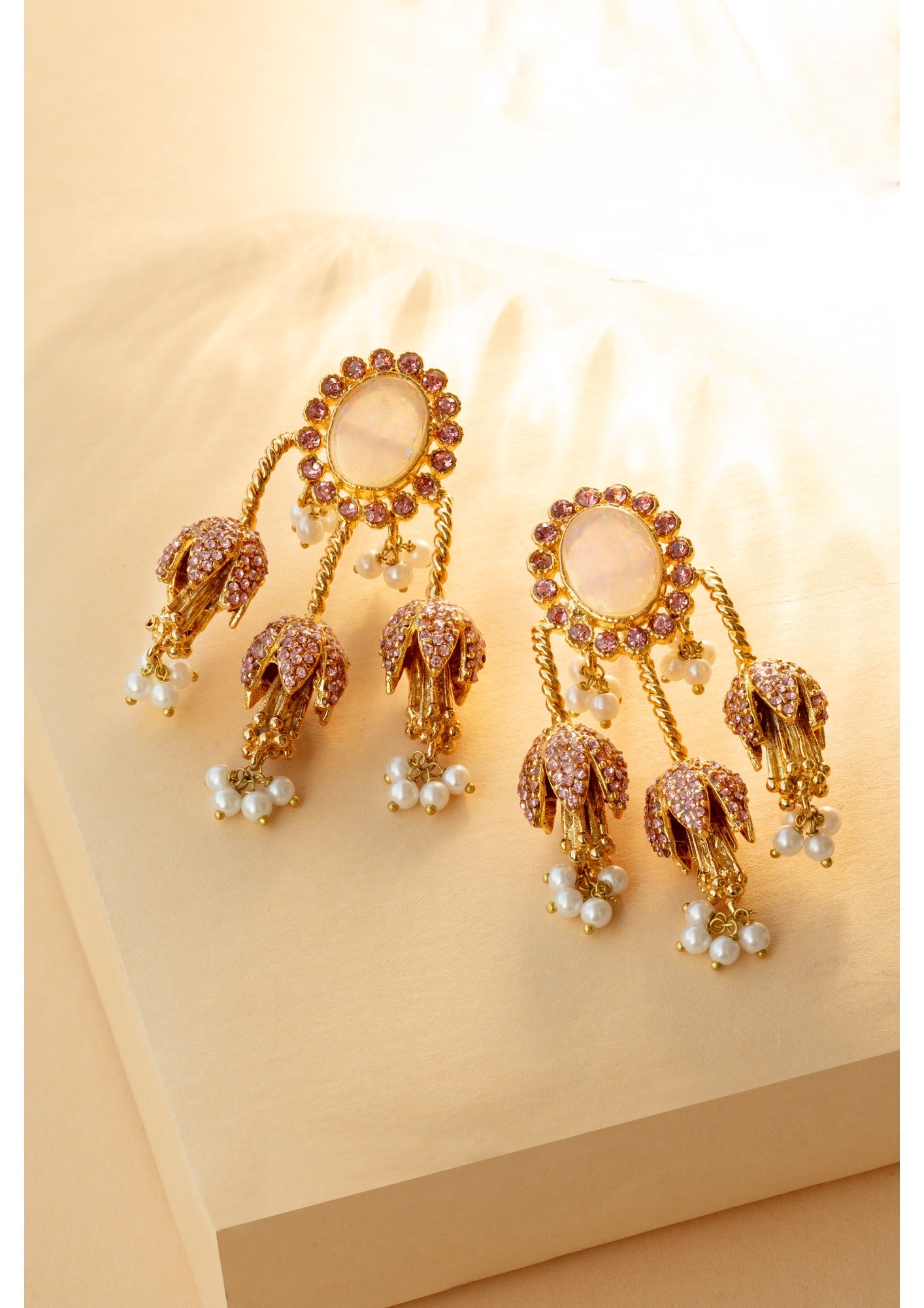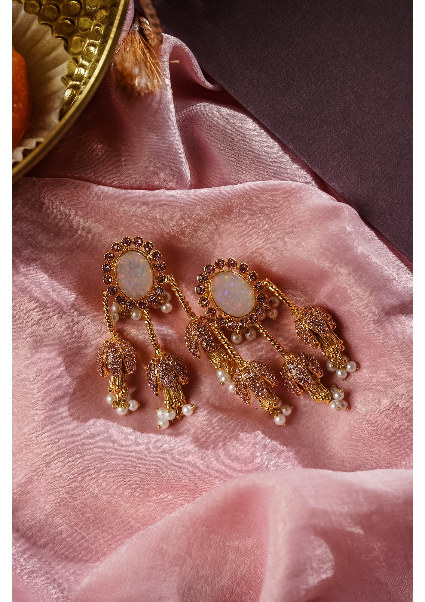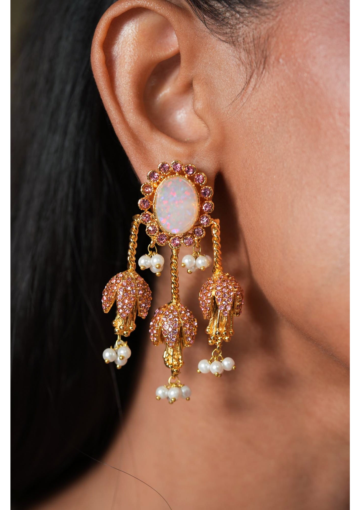 Delicate hibiscus-inspired earrings featuring a soft rose quartz gemstone with a stunning opal centrepiece. 22K gold plated.