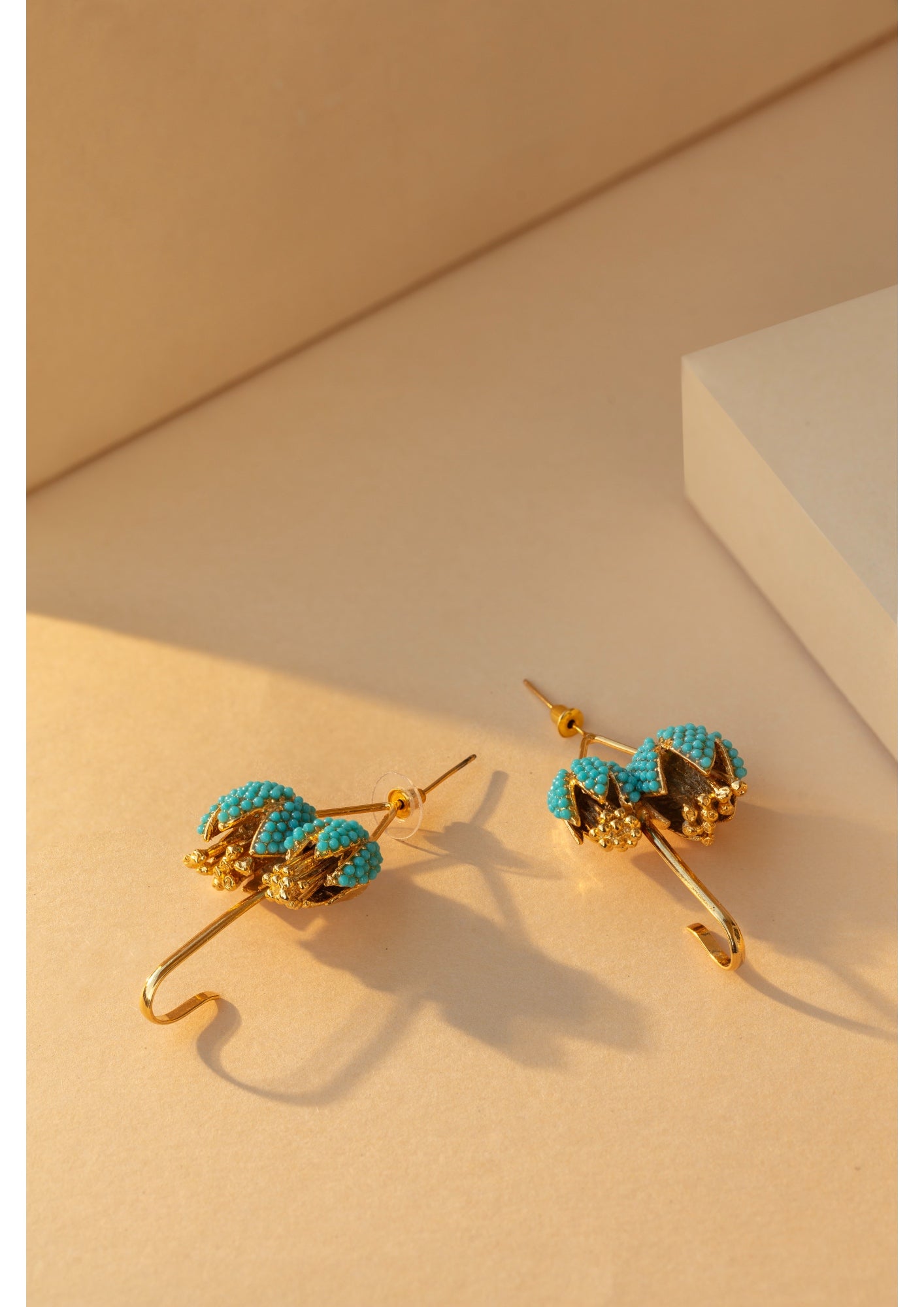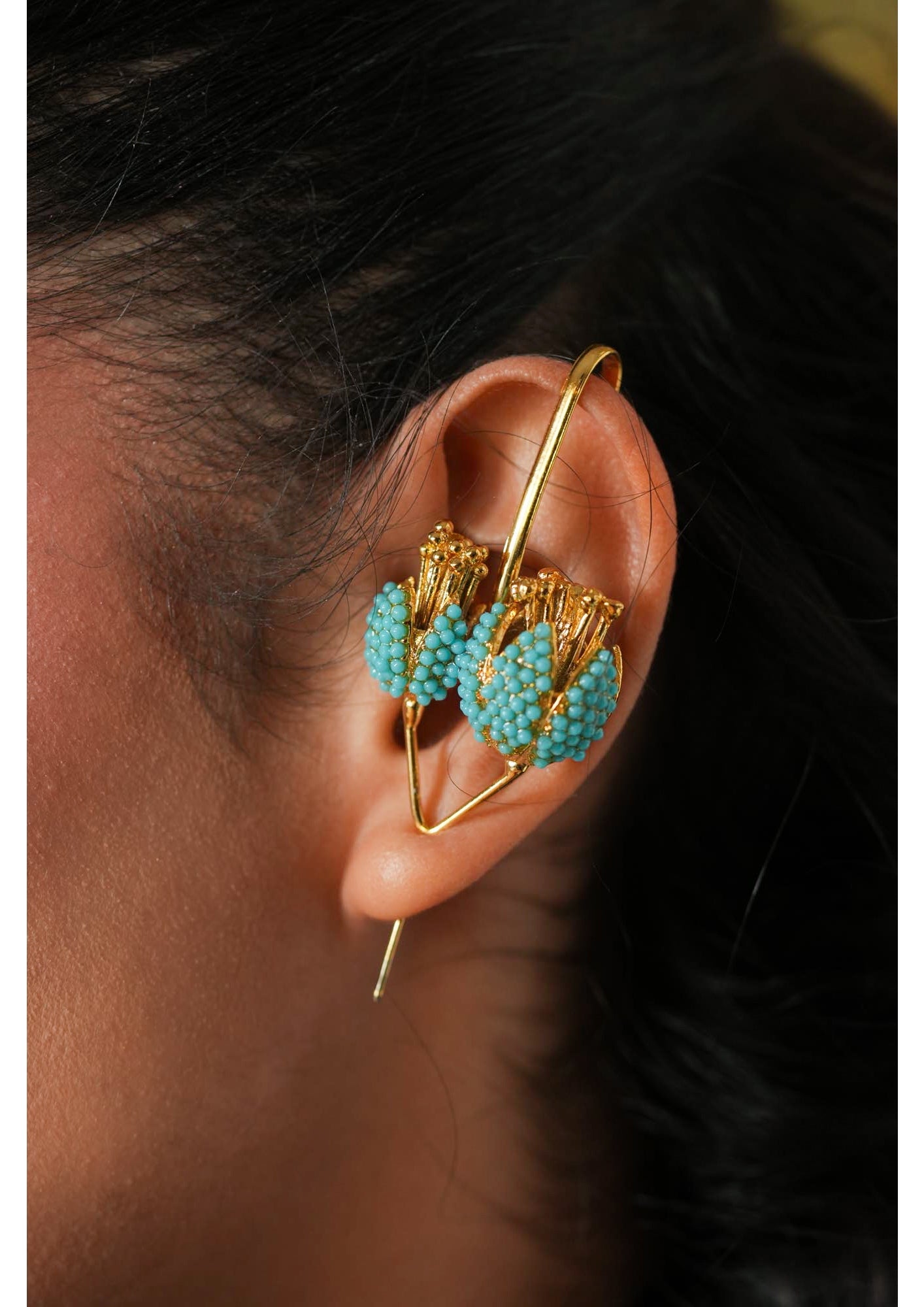 Featuring delicately sculpted buds made from Feroza and pearls, this statement piece is sure to add a bold pop of color to any outfit. 18k gold plated. These are sold individually.