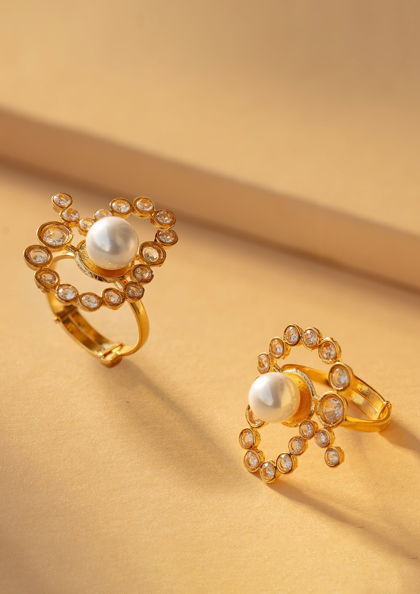 The Rania Ring features a luminous pearl centrepiece framed by a delicate halo of crystals. 18K gold plated. Can be paired with the ‘Rania Tops.’