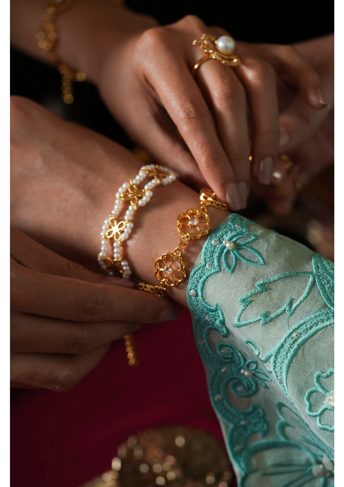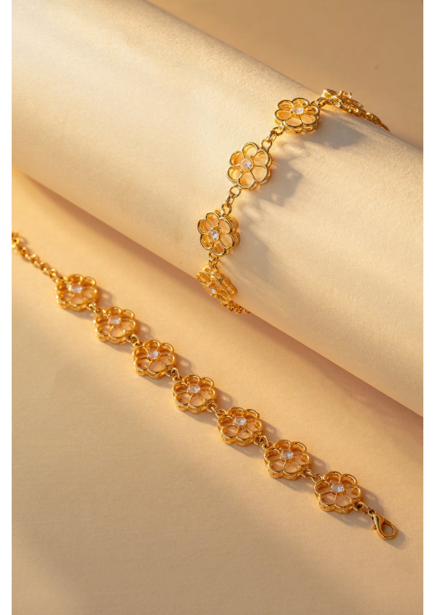 The Rosette Bracelet features a series of delicate flower-shaped links, each centred with a subtle zirconia crystal. 22k gold plated, it is an everyday piece that layers beautifully or stands on its own. Can be paired with the “Rosette Choker.”