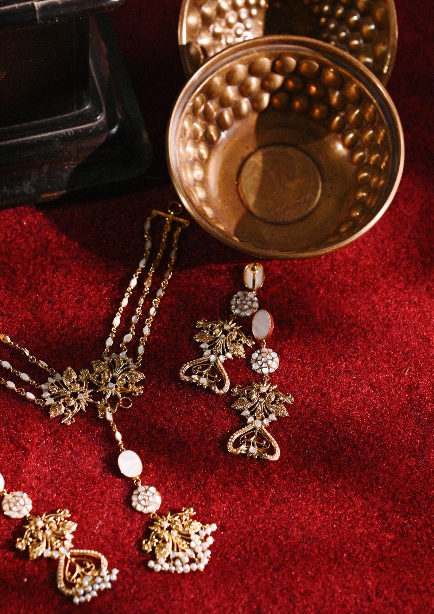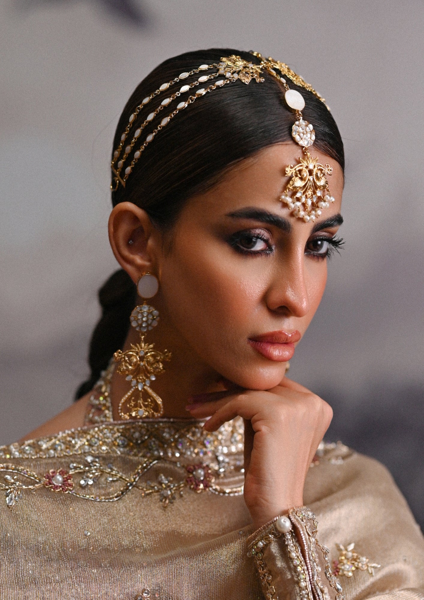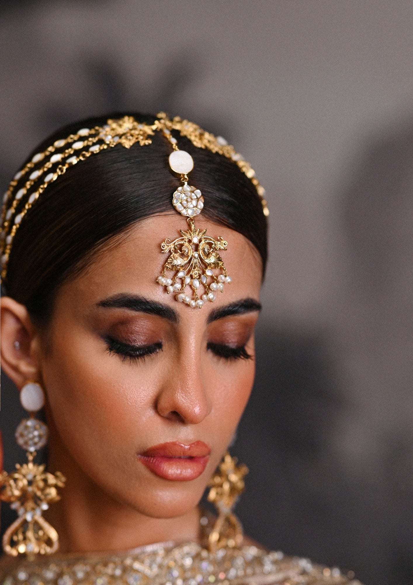 Featuring a striking blend of tradition and artistry, this beautiful Matha Patti features rows of lustrous pearls, with a striking peacock motif inlaid with mosaic pearls for the central Teeka. 22k gold plated.