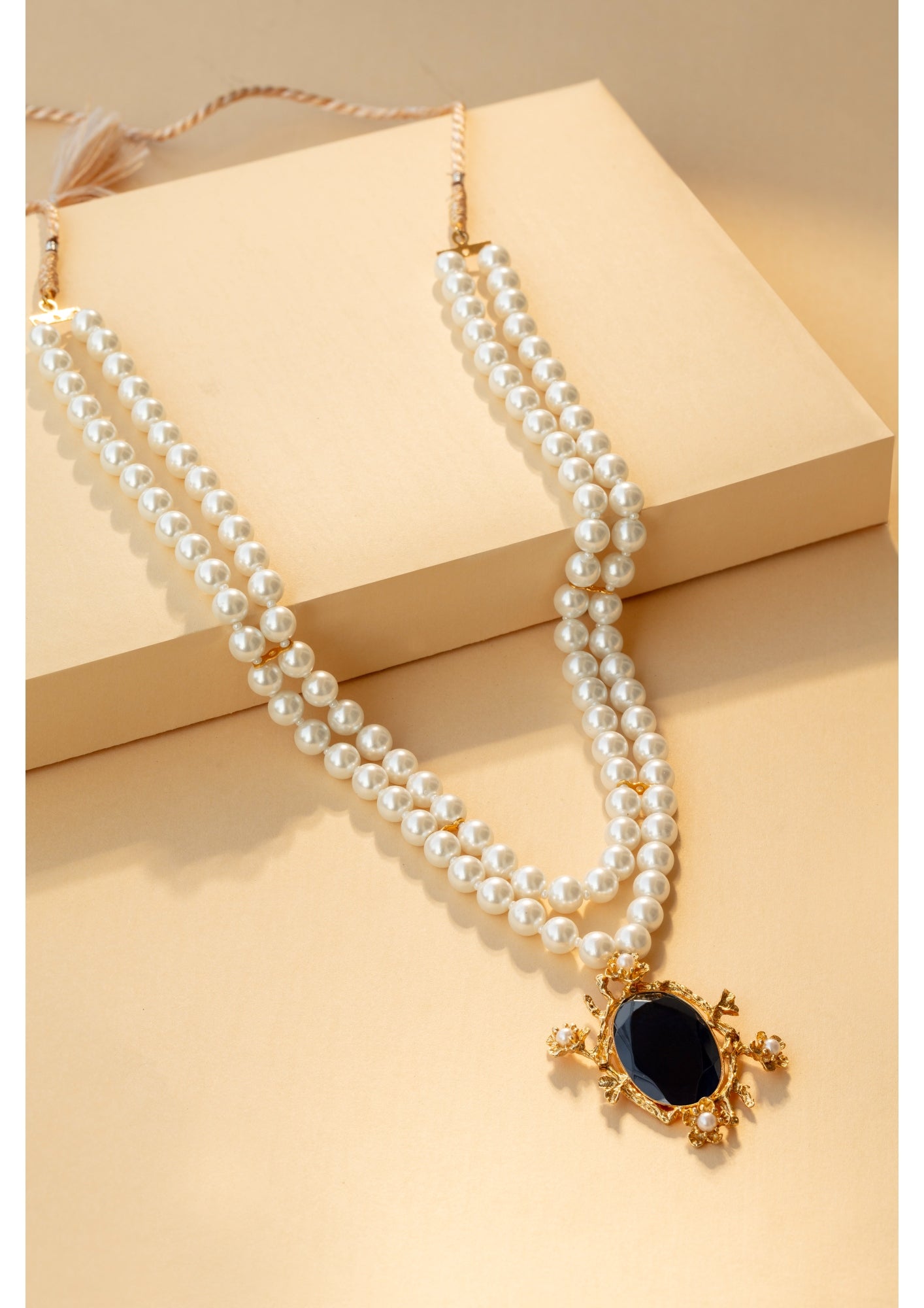 The Laleh Necklace features double strands of pearls with a striking sapphire crystal pendant set within an intricate filigree frame. 22k gold plated. Can be paired with the Laleh Tops.