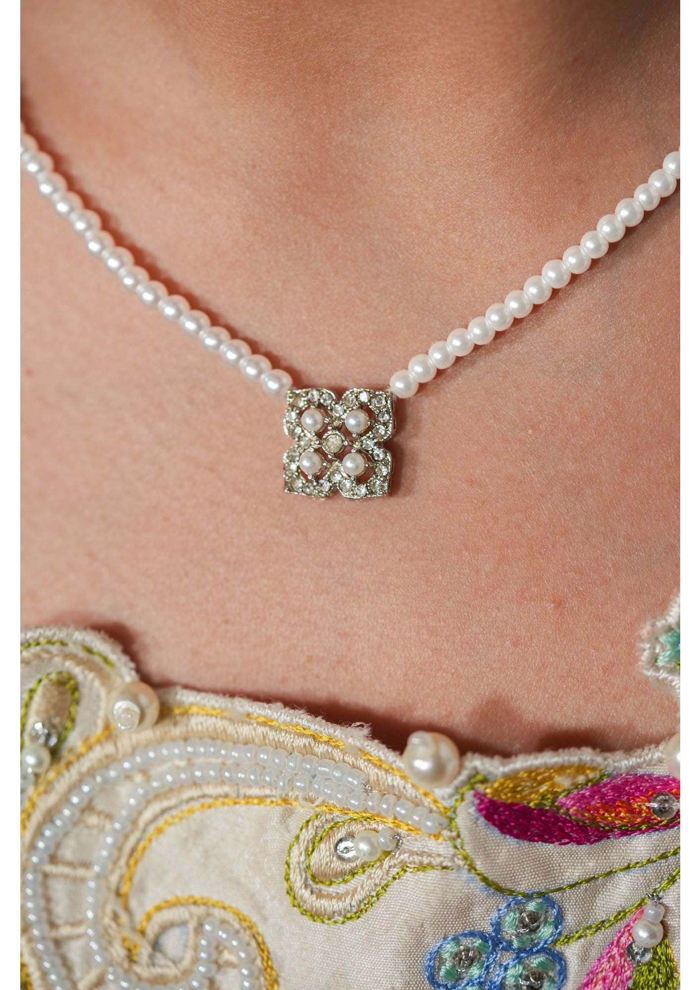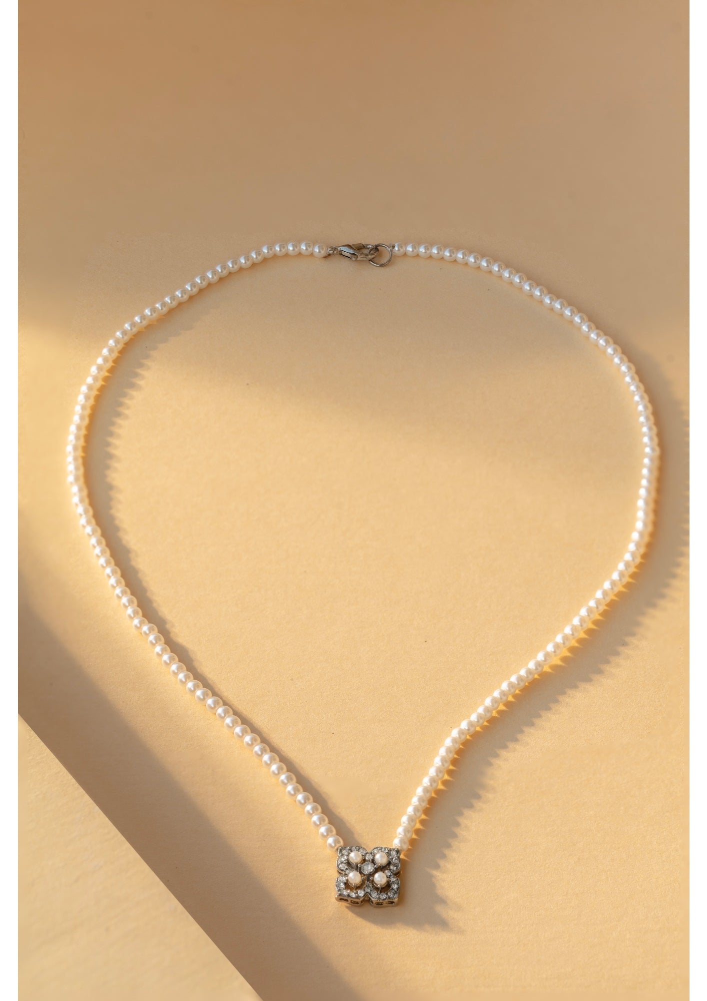 The Nova pendant feature a delicate four-leaf clover motif, formed with crystal detailing, and a slender pearl chain. Sterling silver plated. Can be paired with the “Nova Drops.”