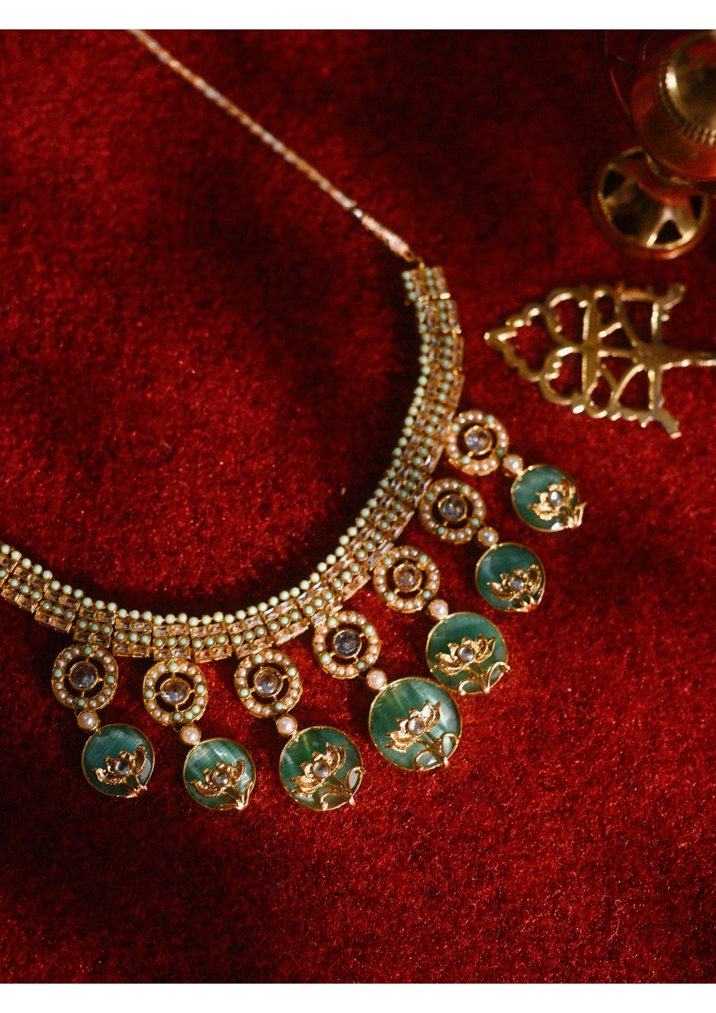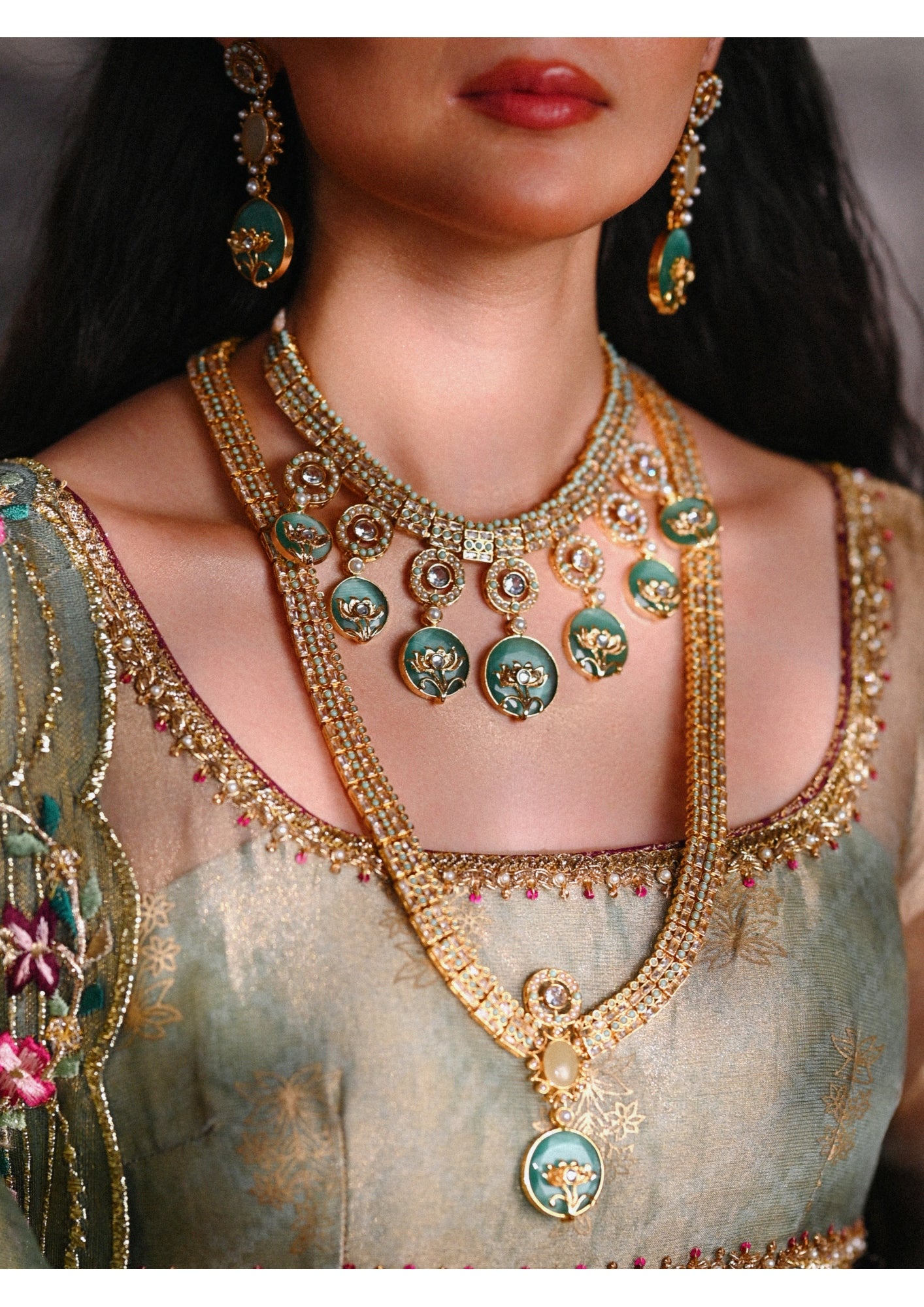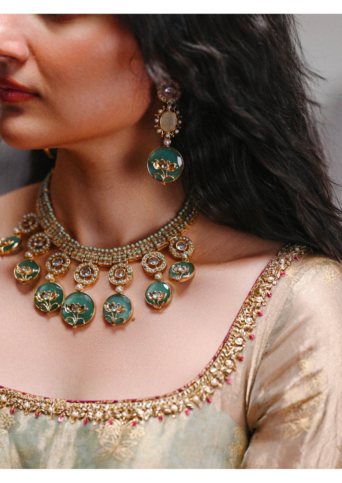 An opulent necklace set in shades of green, featuring Jade and Amazonite crystals. A radiant Lotus flower adds to the subtle beauty, can be paired with the “Raag Maala,” for a layered look. 22k gold plated.